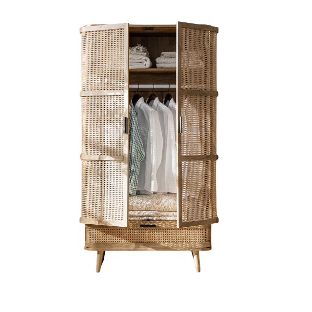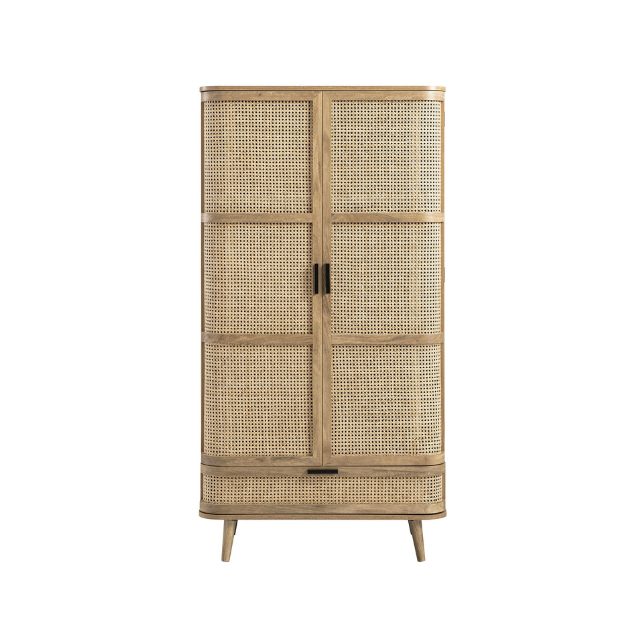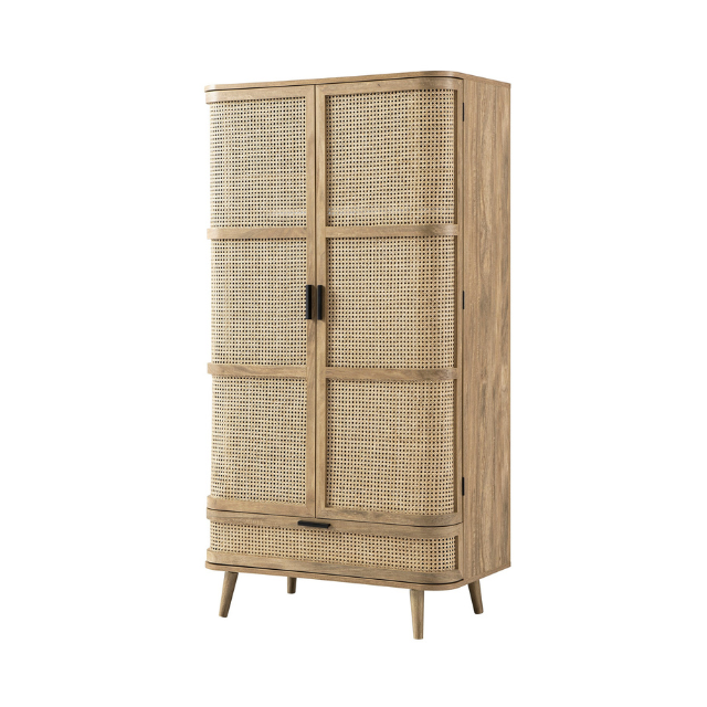 Curved Edge Teak Wardrobe with Full Rattan Doors