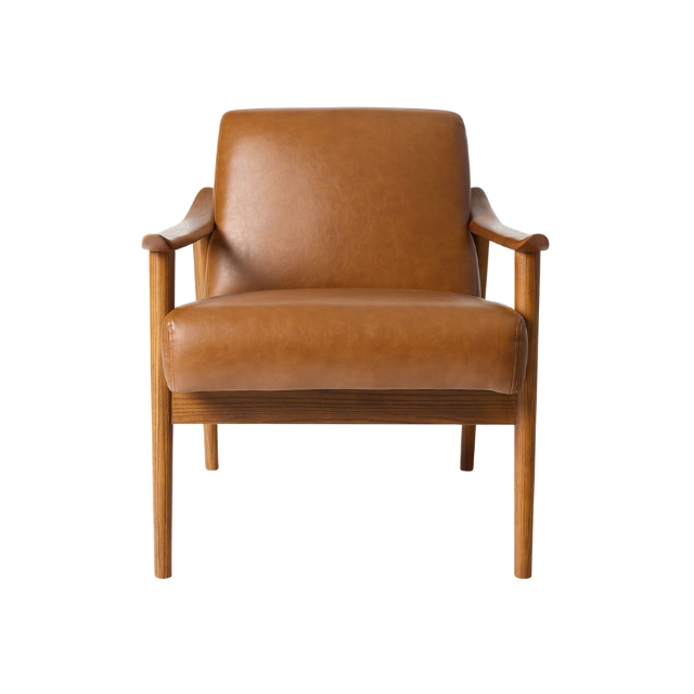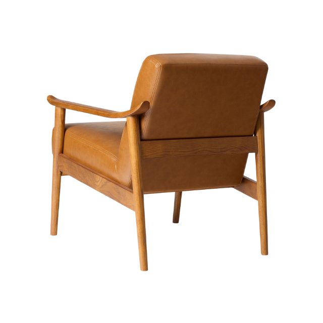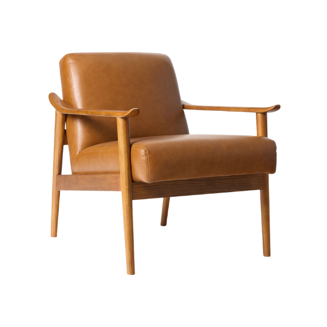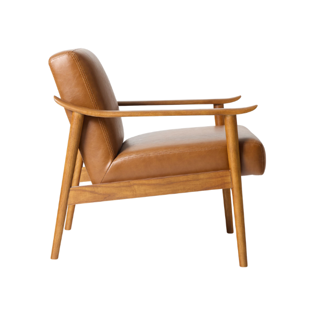 Modern Relax Teak Wood Chair with Upholstered Leather Seat and Curved Armrest