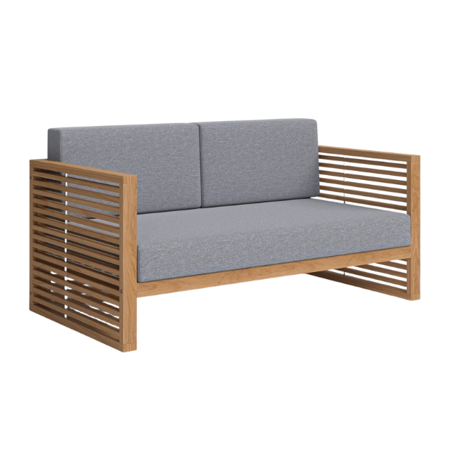 Modern Teak Wood Sofa with Slatted Frame and Comfortable Cushions