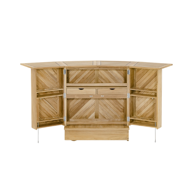 Natural Teak Bar Cabinet with Fold-Out Serving Top and Storage Shelves